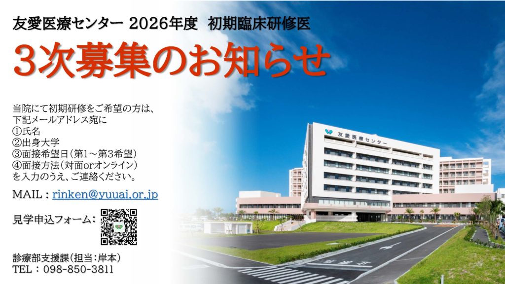 このたび友愛医療センターでは、2026度初期臨床研修医の3次募集を下記のとおり実施いたします。